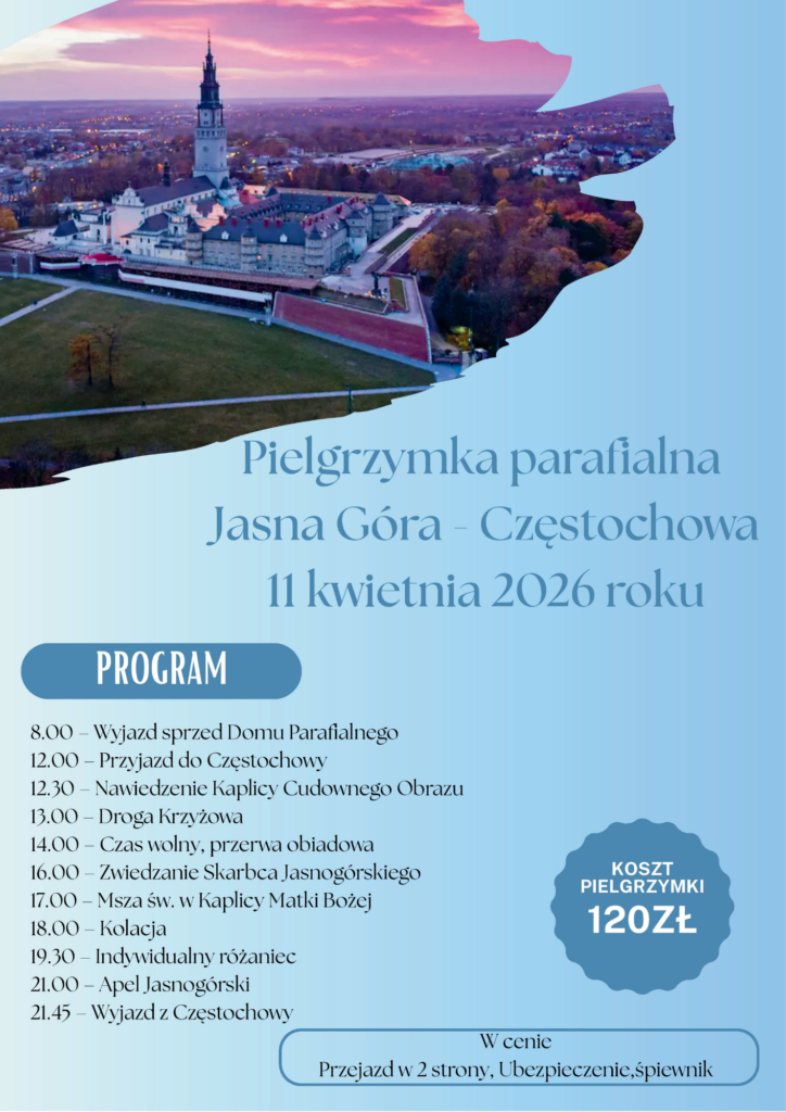 Naszą parafialną pielgrzymkę planujemy w sobotę 11 kwietnia, czyli w pierwszą sobotę po Wielkanocy. Wyjazd autokarem o godz. 8.00. Przyjazd do Częstochowy planowany jest ok. 12.00. Najpierw nawiedzimy Kaplicę Cudownego Obrazu, a następnie o 13.00 odprawimy Drogę Krzyżową na Wałach Jasnej Góry. O godz. 16.00 zwiedzimy Skarbiec Jasnogórski, a następnie o 17.00 odprawimy Mszę św. w Kaplicy Matki Bożej w intencji naszej parafii. O 19.30 planujemy czas na indywidualny różaniec w nowej Kaplicy Najświętszego Sakramentu, a o 21.00 będziemy uczestniczyć w Apelu Jasnogórskim w Kaplicy Cudownego Obrazu. Z Jasnej Góry wyjedziemy o 21.45, aby ok. 1.00 przyjechać do Torunia.